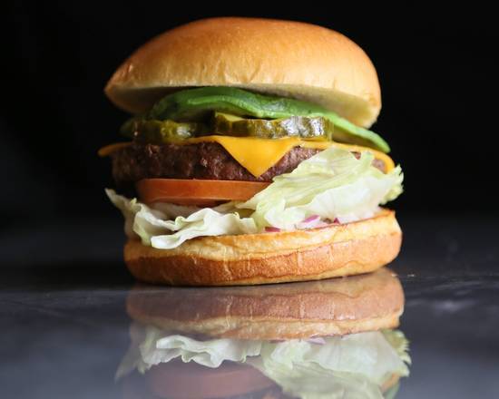 Our Impossible patty with vegan (dairy-free) cheddar cheese, lettuce, tomato, pickles, avocados, raw onions, and vegan mayo sauce