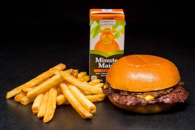 Our traditional 3oz 100% Grass-fed Canadian beef smash burger with cheddar cheese, caramelized onions, and our signature home-made mayo sauce. Comes with a side of fries and an orange juice