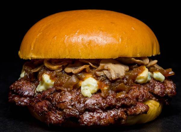 Our traditional 6oz 100% Grass-fed Canadian beef smash burger with blue cheese, mushroom, caramelized onions, and our signature home-made mayo sauce