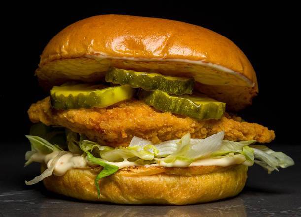 Made with a plant-based vegan chicken patty, lettuce, pickles, and vegan mayo sauce