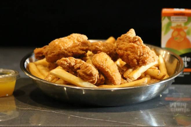 140 grams of crispy tenders made with 100% fresh Canadian chicken breast, served with Honey mustard dipping sauce. Comes with a side of fries and an orange juice.